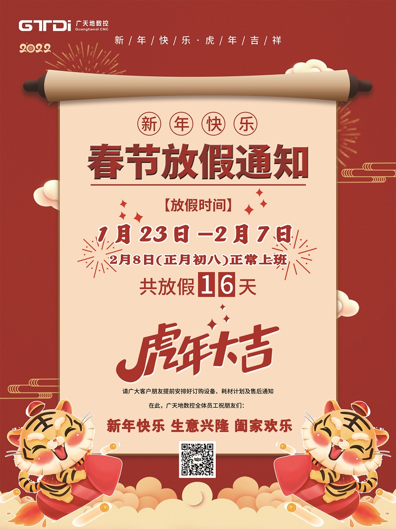 2022年春节将至,首先感谢您在2021年里的鼎力支持和愉快合作,BG真人数控全体同仁在此给您拜个早年。在新年的一年里,BG真人将更加努力,为您提供更优质的服务。按照国家春节放假规定结合我司的具体情况,春节放假时间安排如下:
