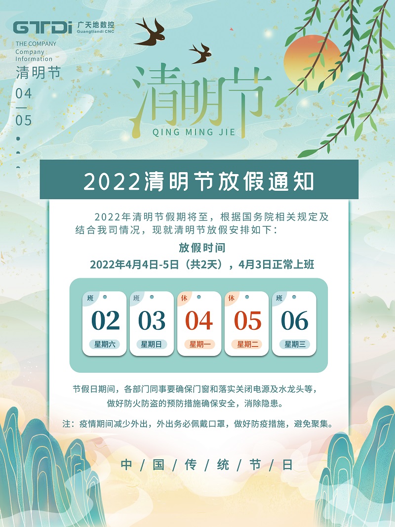 根据国务院办公厅《关于2022年部分节假日安排的通知》,并结合我司实际情况,BG真人数控2022年清明节放假安排如下:
