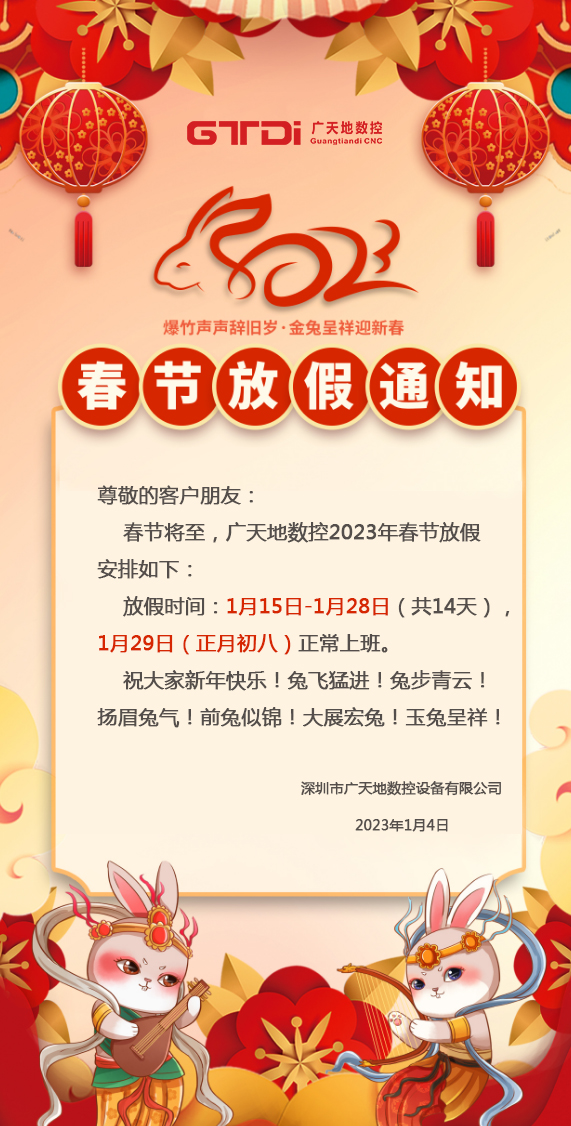 2023年春节将至,首先感谢您在2022年里的鼎力支持和愉快合作,BG真人数控全体同仁在此给您拜个早年。在新年的一年里,BG真人将更加努力,为您提供更优质的服务。按照国家春节放假规定结合我司的具体情况,春节放假时间安排如下: